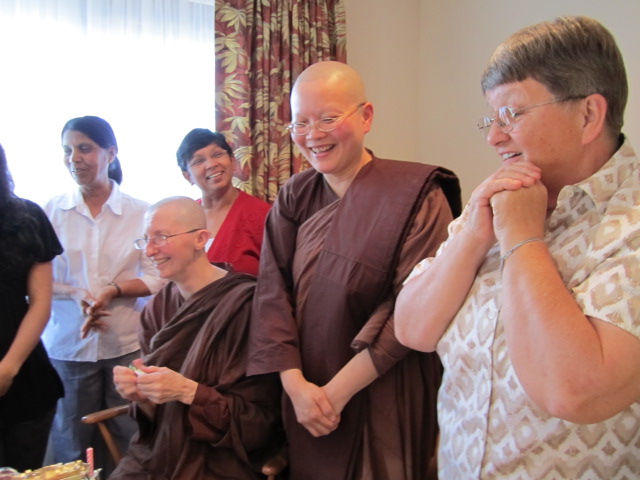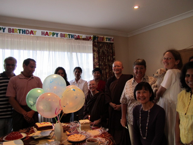 We got together after the End of Rains Ceremony for afternoon tea to celebrate Ajahn Vayama’s birthday. The afternoon tea was filled with ballons, presents, sweets and various afternoon allowables. The birthday cheers were led by Peace and Billy. In all our hearts, we would like to cheer Ajahn Vayama on, “go, go, go, Ajahn”, “go for the attainment of Nibbana, Ajahn!” All of us are very grateful to Ajahn Vayama for her teachings, guidance and leadership in the practice of Dhamma.