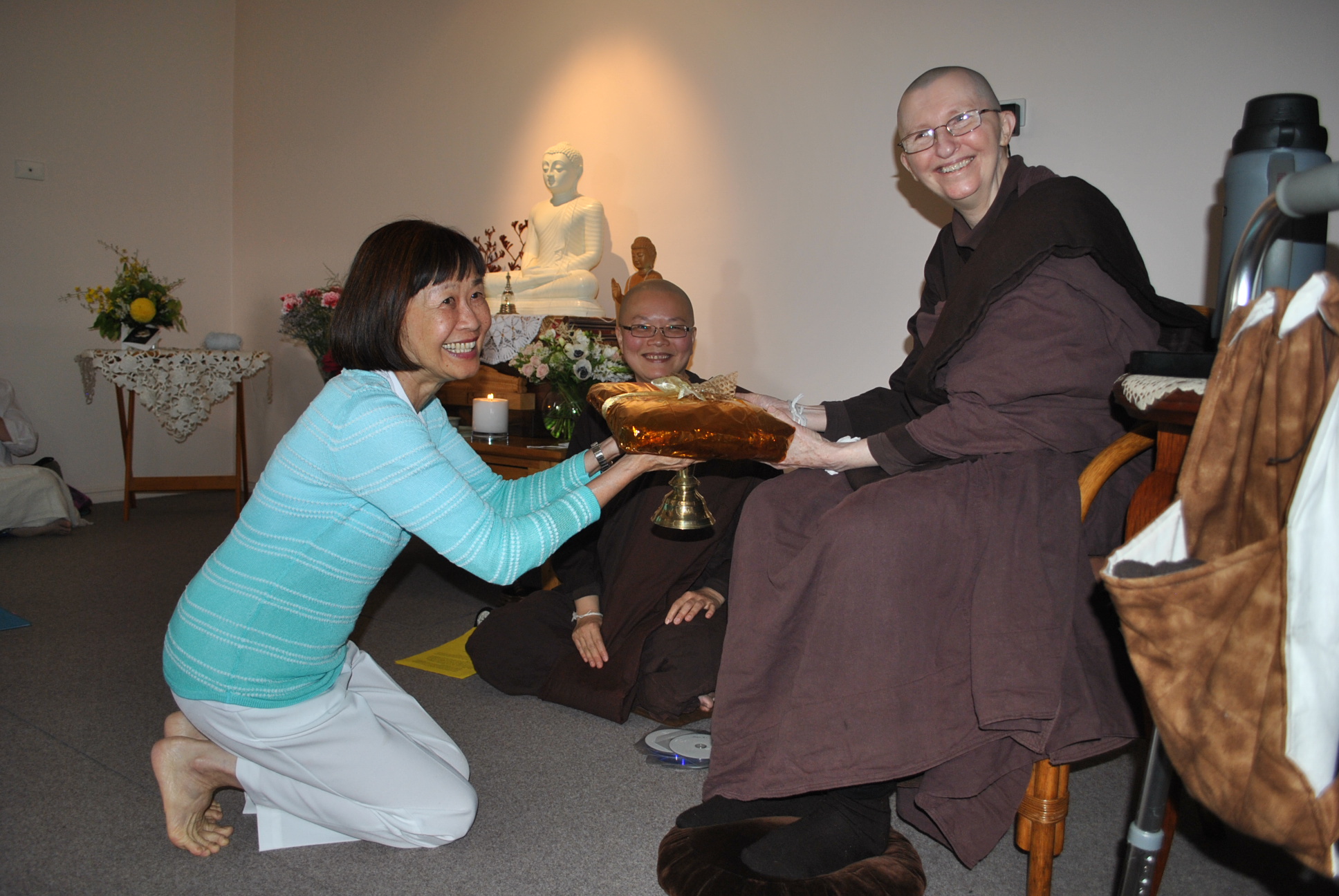 One of our supporters of Patacara Bhikkhuni Hermitage, Ming Cassim, who is also the treasurer of Patacara Bhikkhuni Hermitage Incorporated, offered cloth to the bhikkhunis of Patacara Bhikkhuni Hermitage. Ming Cassim is one of the long time supporters of Ayya Vayama Bhikkhuni, since the time Ayya Vayama Bhikkhuni spent the Rains Retreat at Bodhinyana Monastery in 1998.