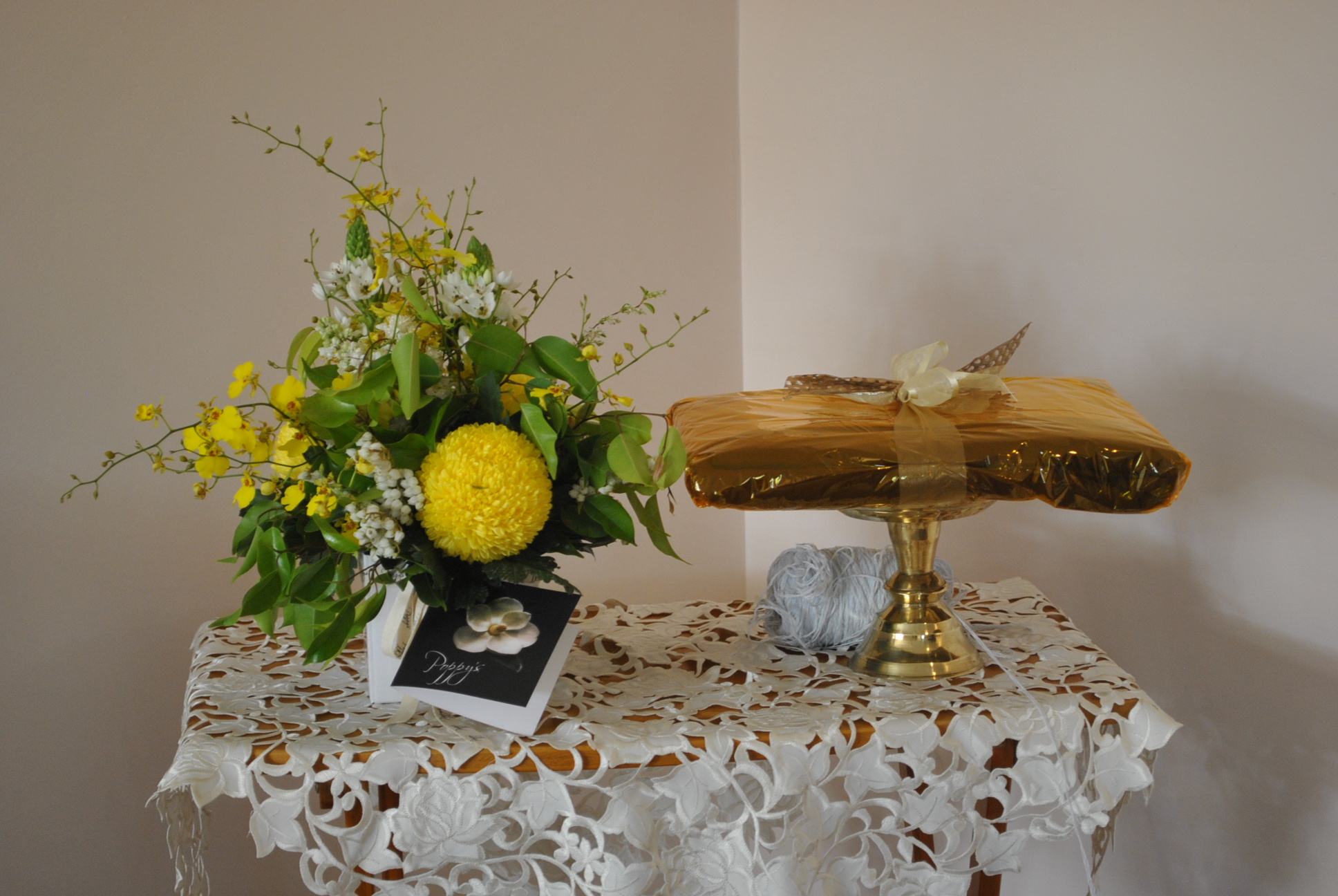 The beautiful flowers for Ayya Vayama’s birthday and the cloth material at the End of Rains Cloth Offering Ceremony 2014. Photo by Havindra.