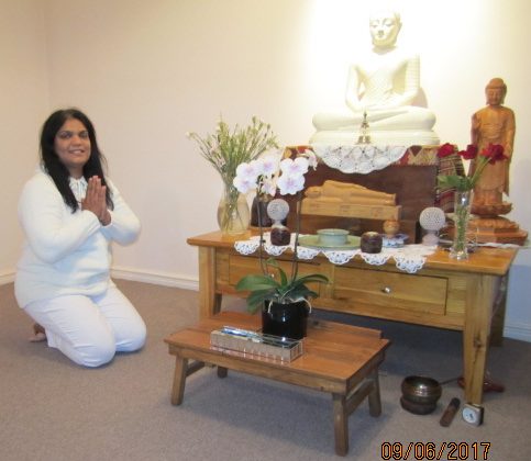 Chandrika Perera pays respect to the Buddha in the Sala of Patacara Bhikkhuni Hermitage before head shaving on 9th June 2017. Photo by Ming.
