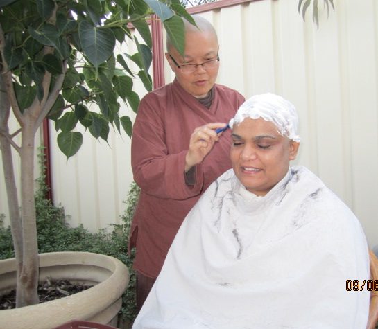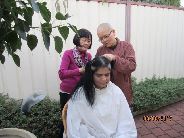 On the evening of 9th June 2017, with the full moon slowly appearing, courageous Chandrika watched with joy and equanimity as Ayya Seri began to cut off her long, beautiful locks of hair .