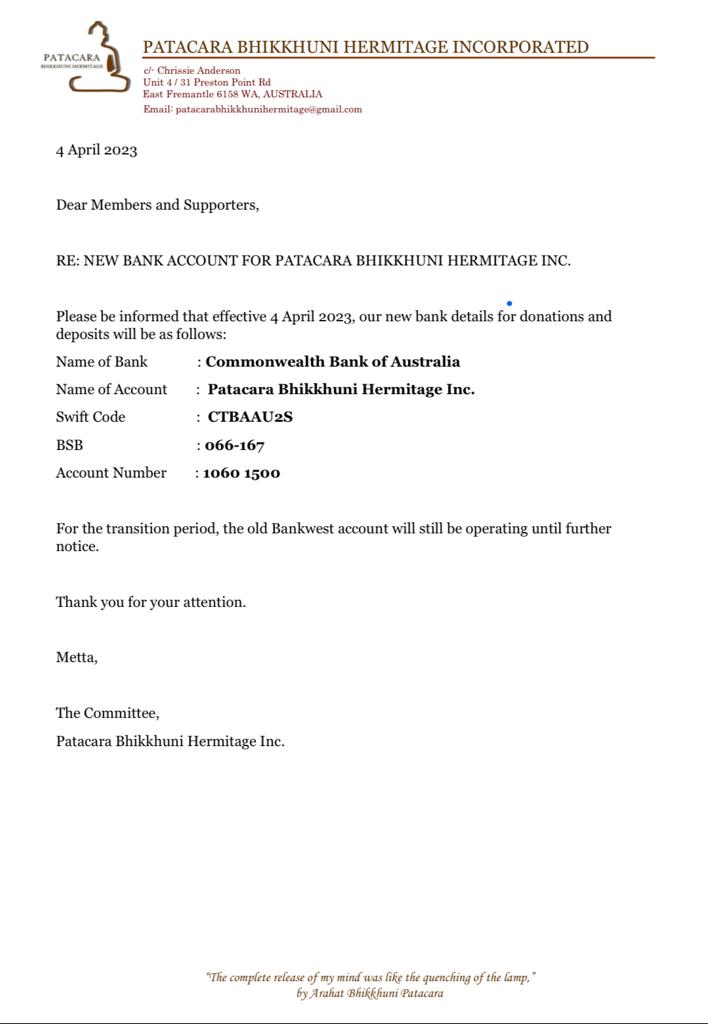 New Bank Account For Patacara Bhikkhuni Hermitage