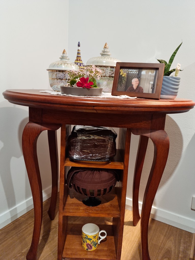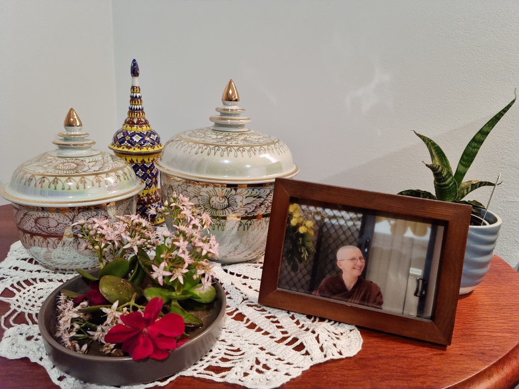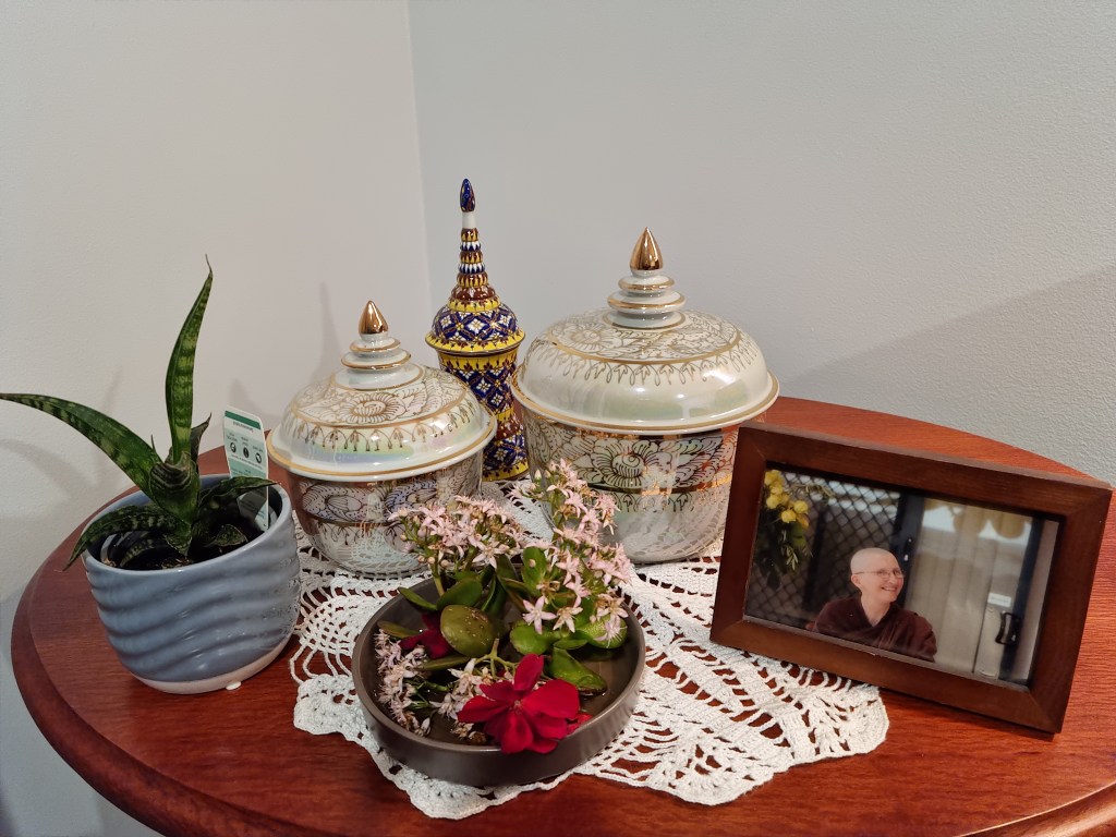 The urns now reside in the Shrine Room of Patacara Bhikkhuni Hermitage.