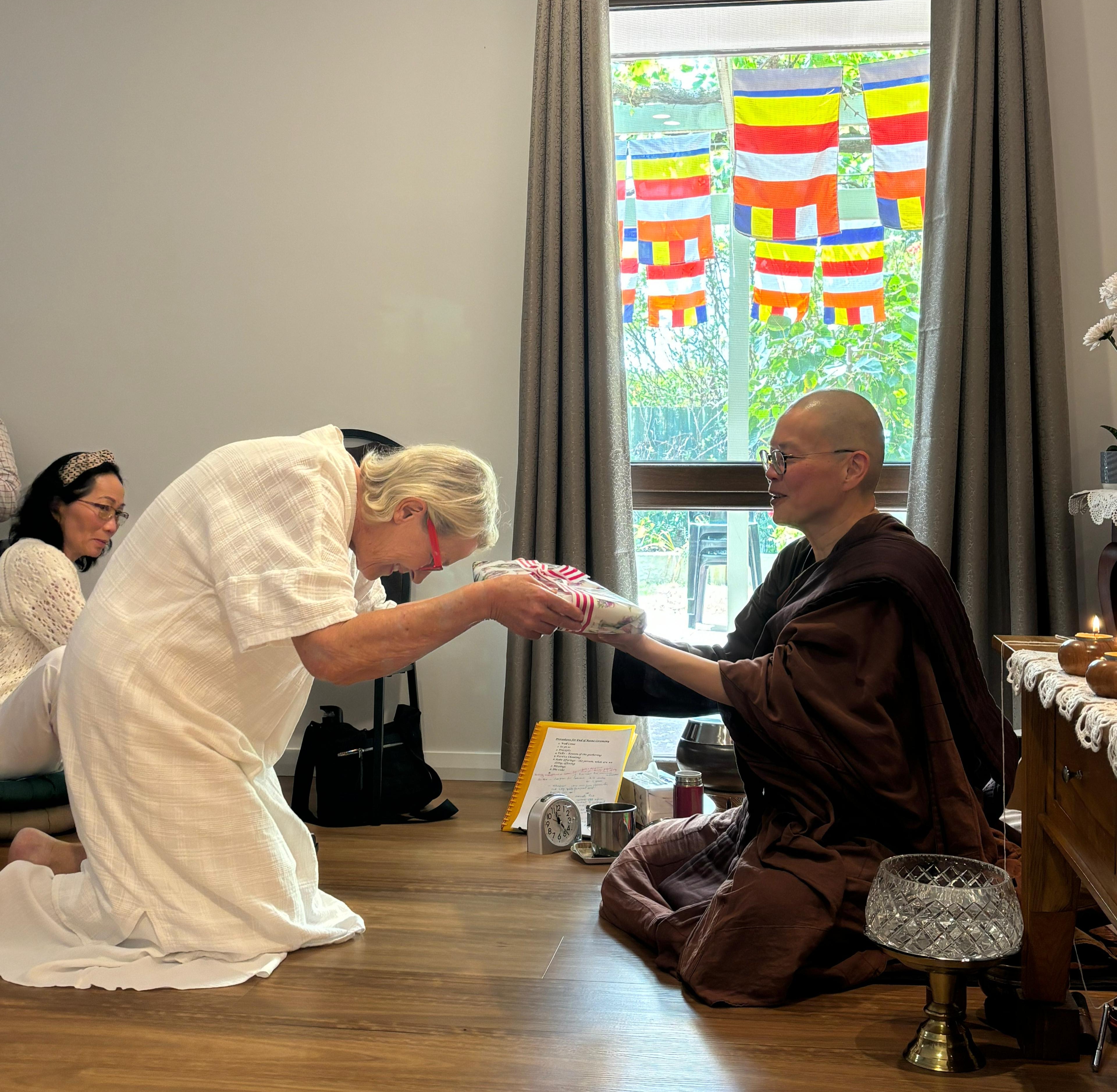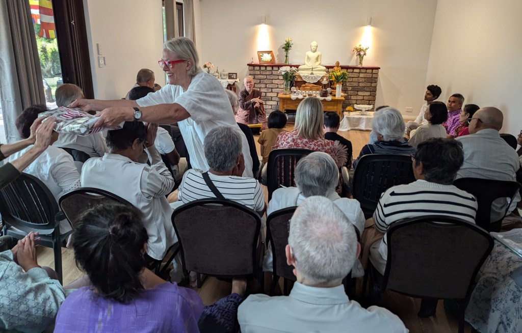 As the representative of the community of Patacara Bhikkhuni Hermitage, Chrissie Anderson offered the robe cloth to the bhikkhuni of the Hermitage.