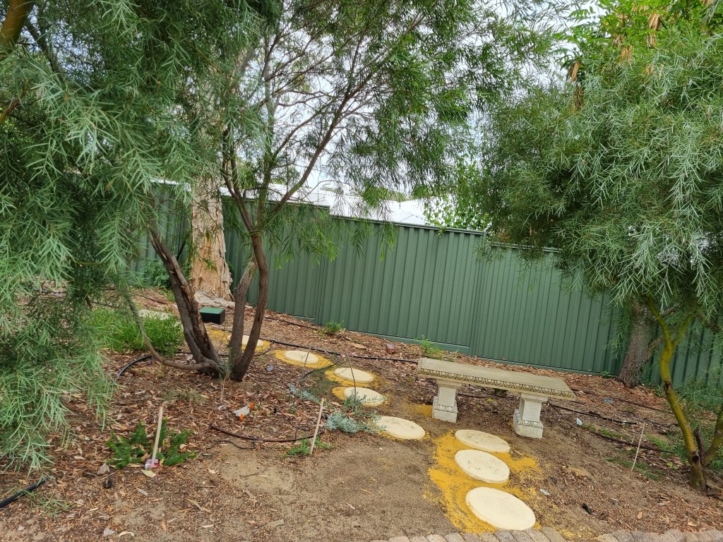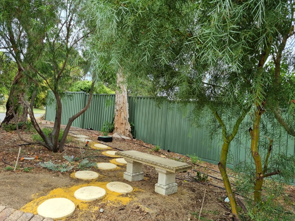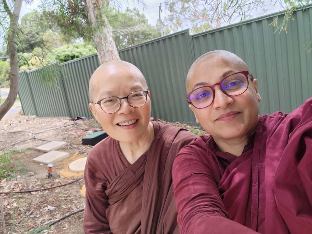 The afternoon of 22 January 2025 found Ayya Seri and Venerable Dhammadheera sitting on the newly installed stone bench and the eight stepping stones in the native garden of Patacara Bhikkhuni Hermitage.